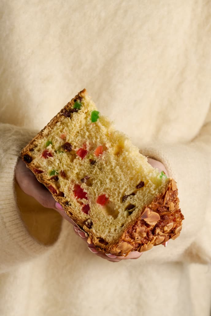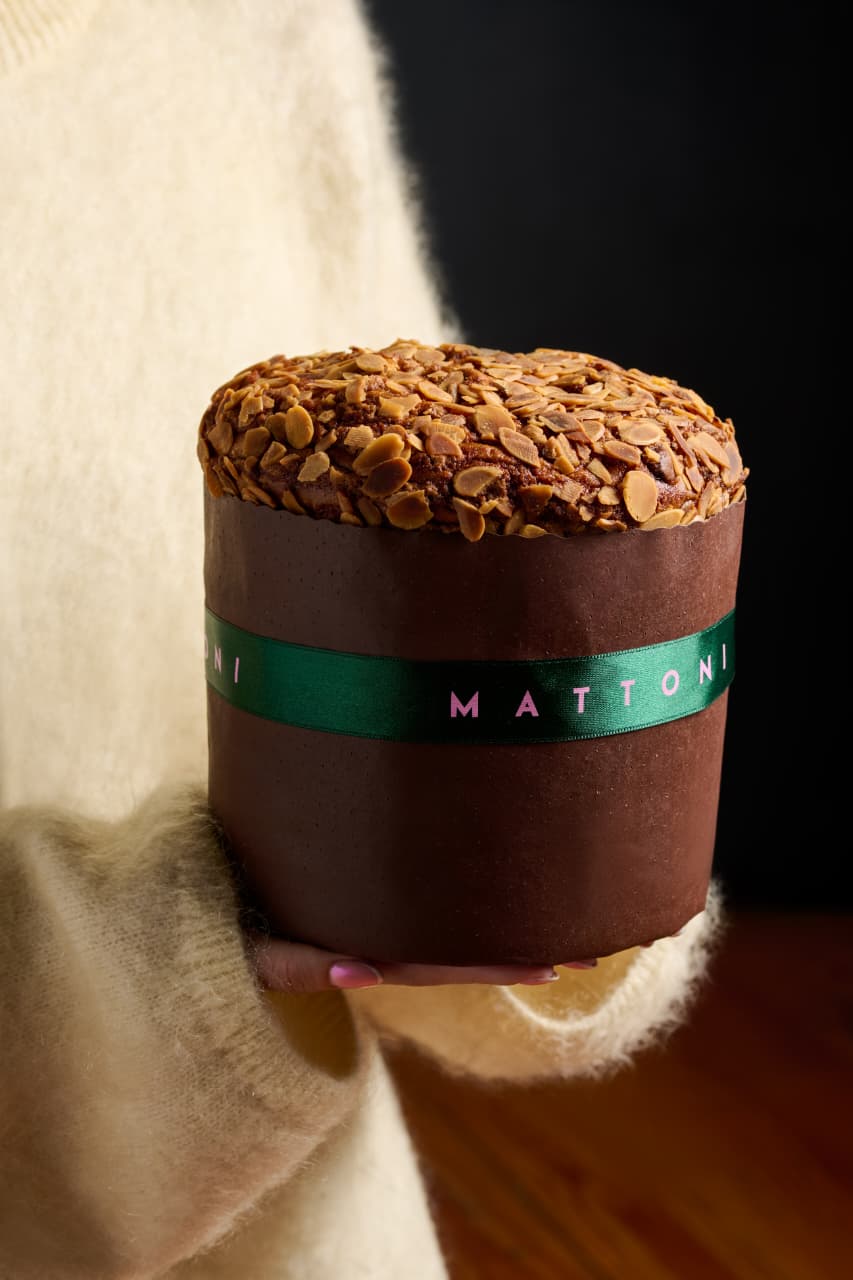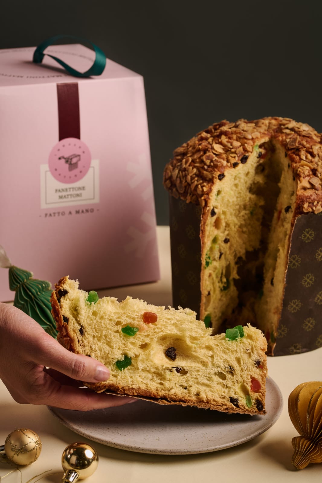 Panetón a base de masa madre, hecho a mano 100%, con frutas y pasas seleccionadas, tiene una cobertura de harina de almendras y almendras laminadas.